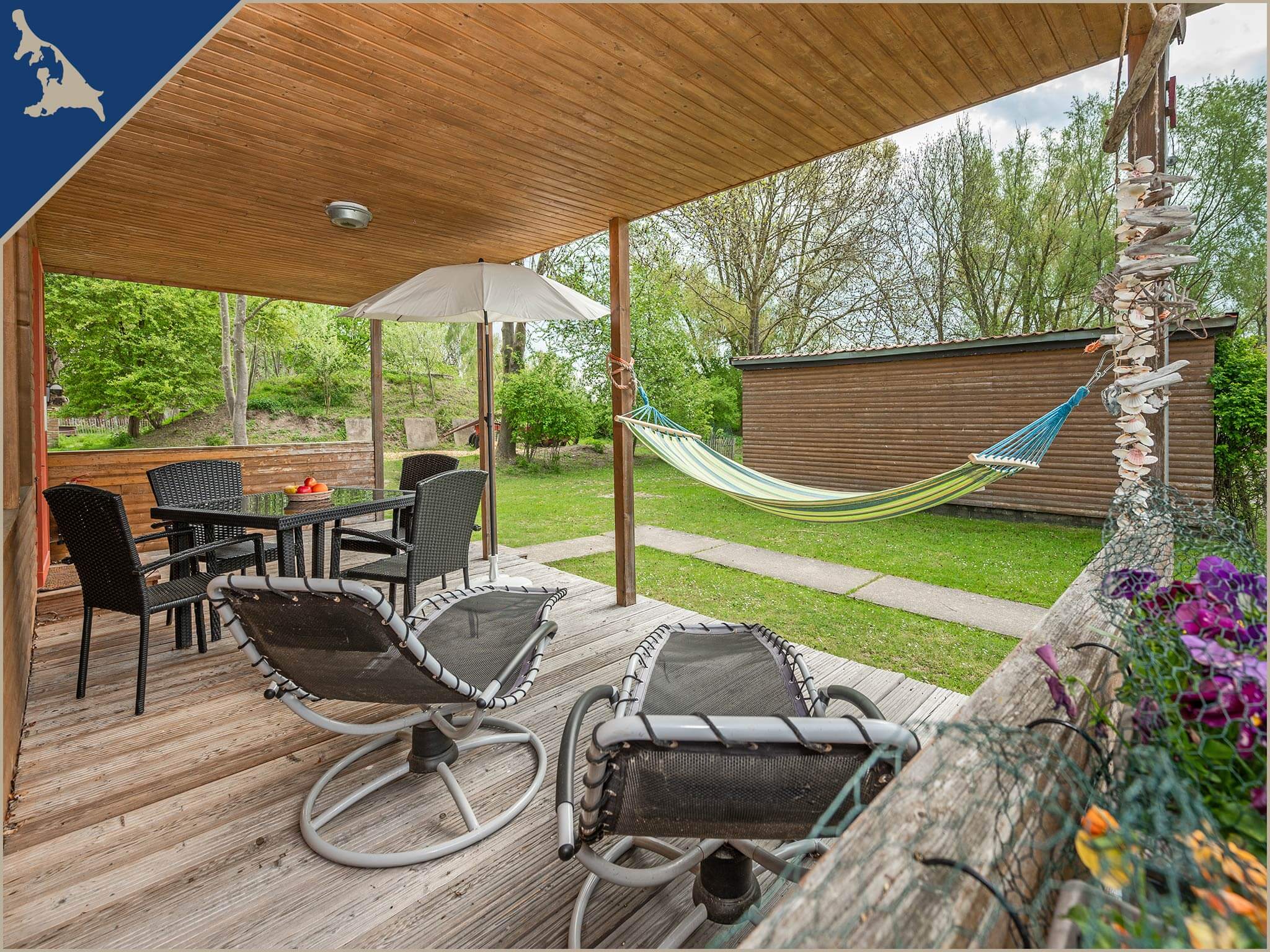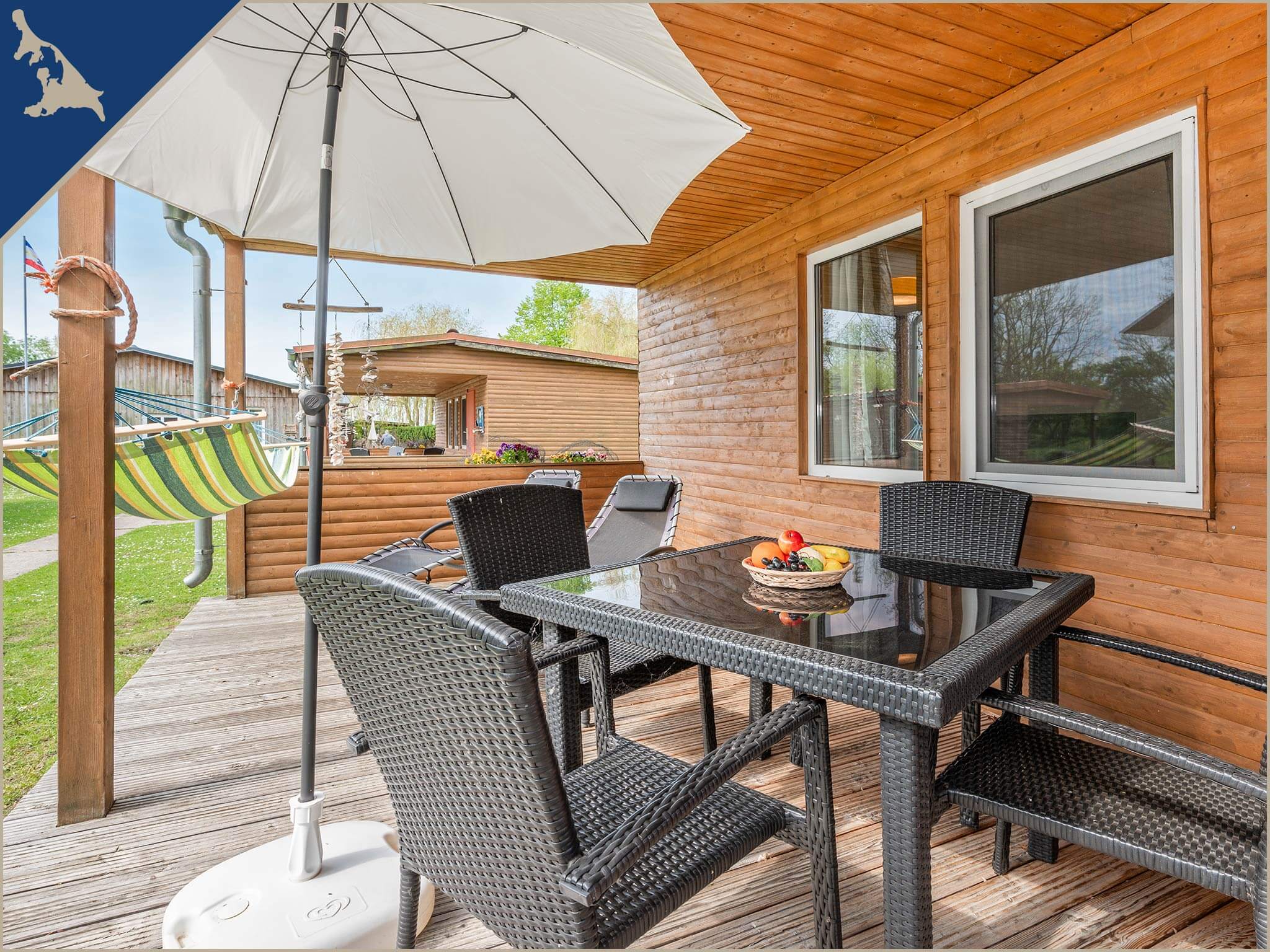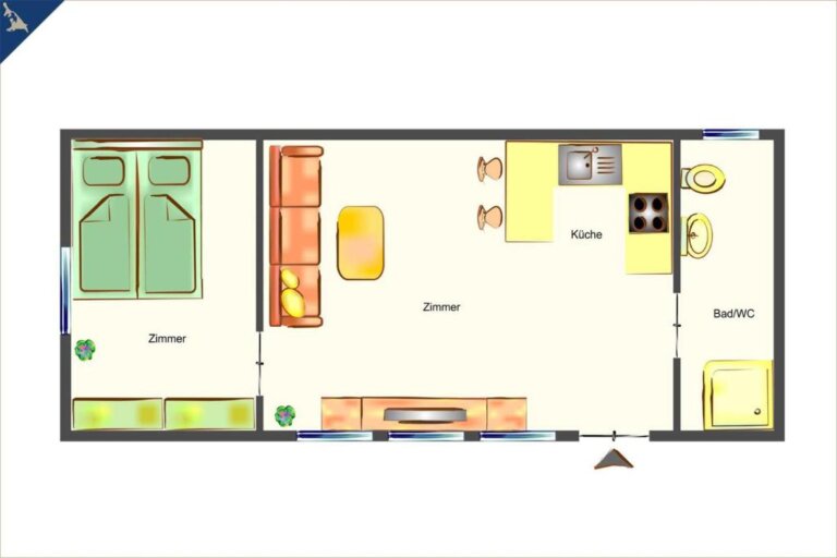 Die voll ausgestattete Einbauküche ist mit einem Zwei-Platten-Ceranherd, Kühlschrank mit Gefrierfach, Wasserkocher, Toaster, einer Kaffeemaschine sowie ausreichend Geschirr großzügig bestückt. Im Bad des Bungalows finden Sie die Dusche und das WC, einen beheizbaren Handtuchhalter, Haarföhn als auch einen beleuchteten Spiegel.