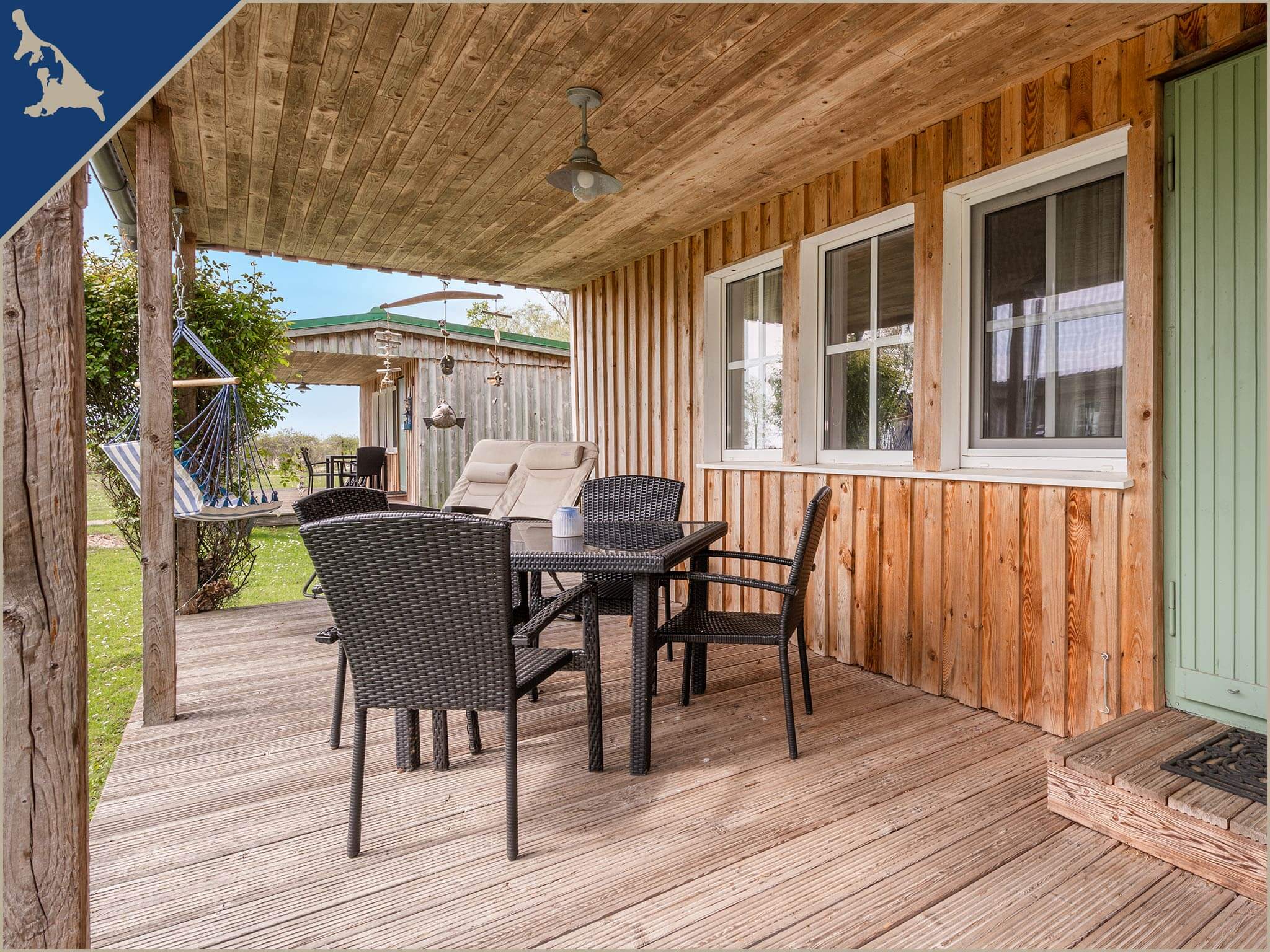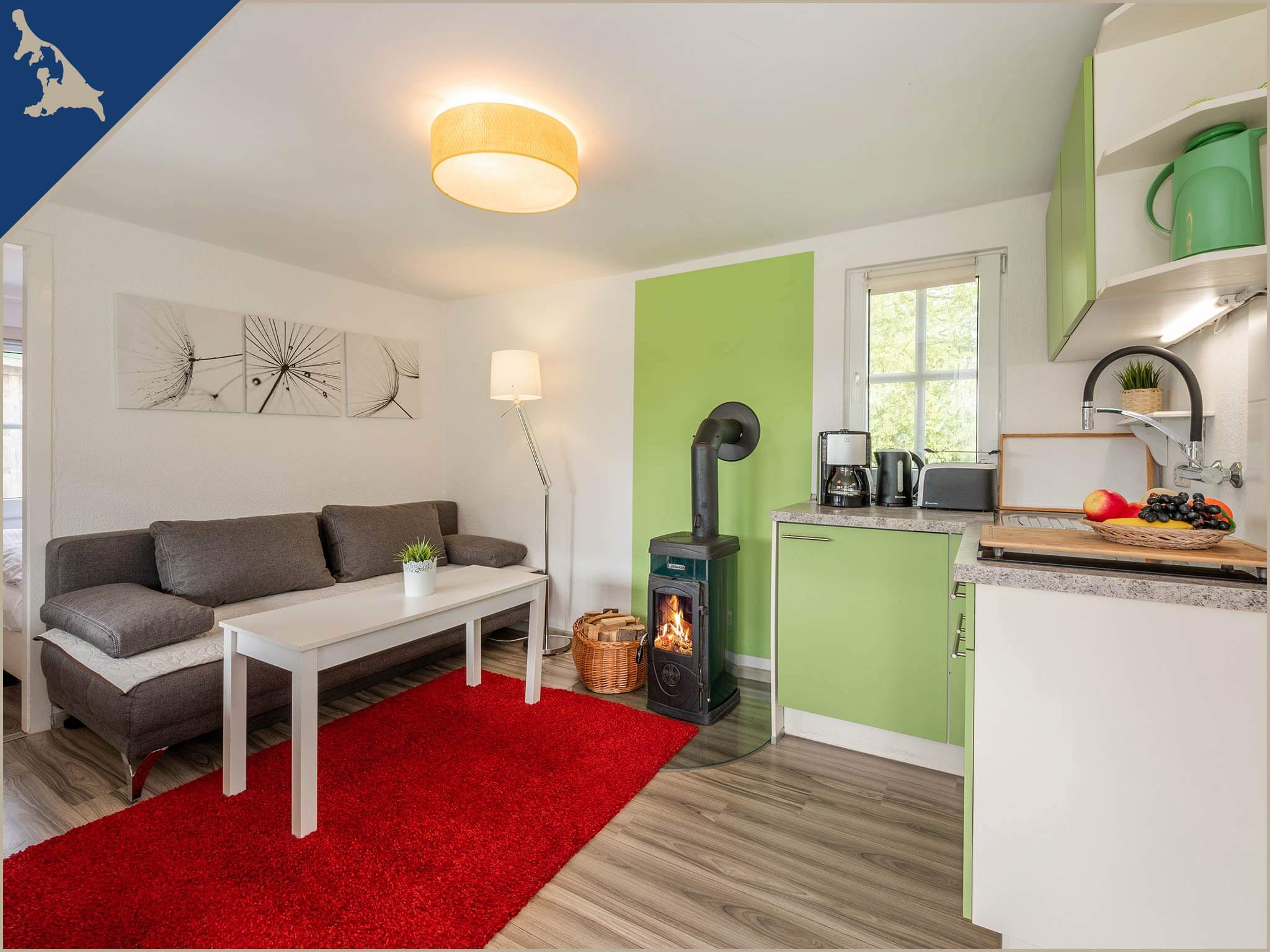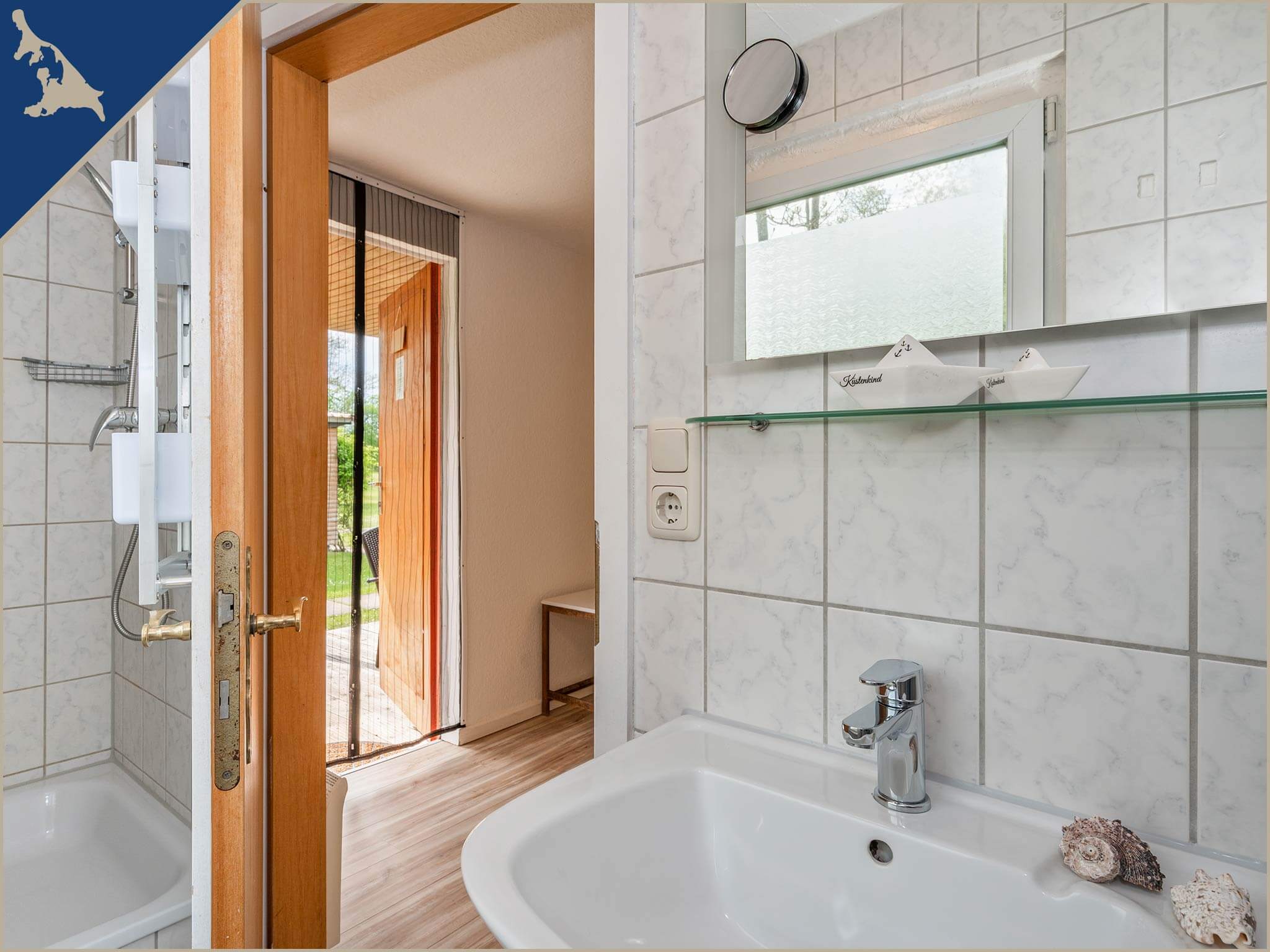 Die voll ausgestattete Einbauküche ist mit einem Zwei-Platten-Ceranherd, Kühlschrank mit Gefrierfach, Wasserkocher, Toaster, einer Kaffeemaschine sowie ausreichend Geschirr großzügig bestückt. Im Bad des Bungalows finden Sie die Dusche und das WC, einen beheizbaren Handtuchhalter, Haarföhn als auch einen beleuchteten Spiegel.