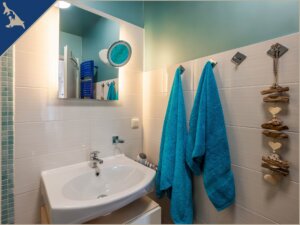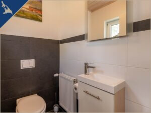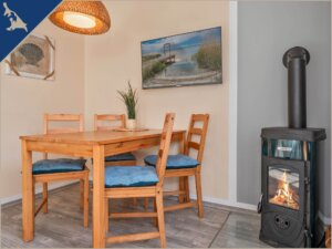 Ferienwohnung: Die Ferienwohnung hat ein großes Wohnzimmer mit Sitzgruppe, zwei Schlafzimmer (Aufbettung durch Schlafsofa im Wohnzimmer von 4 auf 6 Personen möglich), Esstischgruppe und Kamin. Die Dusche ist ebenerdig, das WC befindet sich in einem separaten Raum. Die Küche ist zudem mit einem Geschirrspüler ausgerüstet. In dieser Ferienwohnung befinden sich zwei Schlafzimmer mit Boxspringbetten. Kaminholzkorb mit Anzünder kann vor Ort erworben werden.